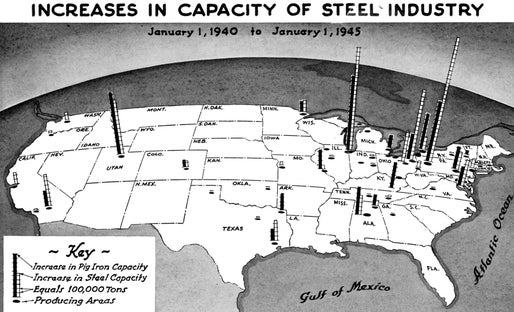 This map depicts the increase on iron and steel production in the United States during World War II. Note that the column over Pittsburg is the highest on the map.